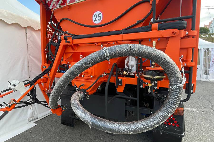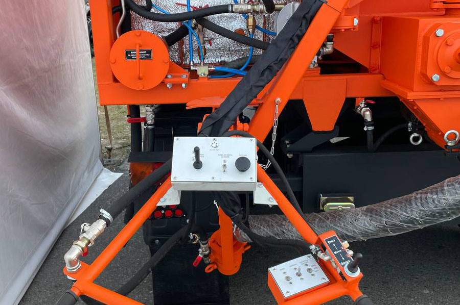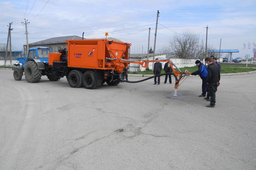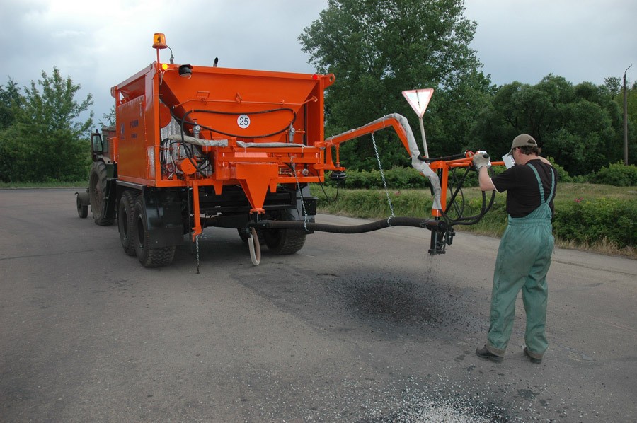 Компоненты смешиваются в рабочем органе установки. Практически сразу по отремонтированному участку возобновляется движение транспорта. Входящее в комплект устройство — «удочка» с двумя сменными форсунками позволяет заливать узкие щели покрытия только битумной эмульсией и распылять битумную эмульсию по поверхности дорожного полотна.
